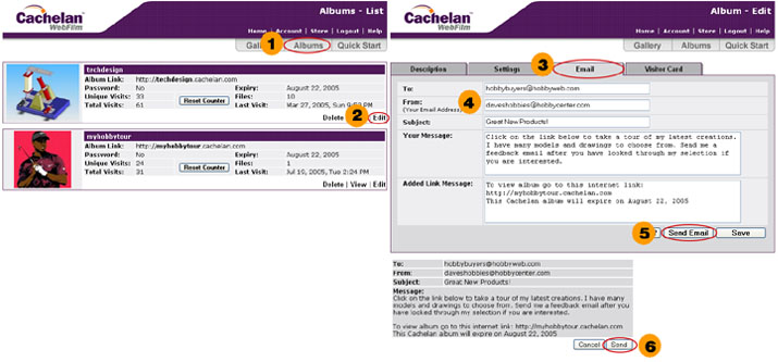 From the "Album - List" screen select Edit > Email Tab. Compose an email to invite visitors to your new album. For multiple visitors, separate their email addresses with a comma on the 'To' line. Add a personal message. The necessary link information is shown below your message and is automatically appended to the email. Click the Send email button, review the message in the popup box, then click OK to send the email. Your visitors can access the new album from their browser as soon as they receive the email by clicking the automatically added link in the email.