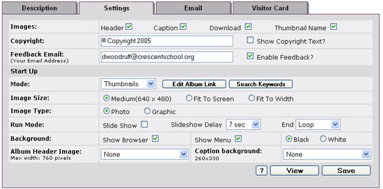 To access the settings of your album click the "Settings" tab. A screen will appear that allow you to full customize the look of your album. The default settings (shown above) start your as a series of thumbnails. The user will be able to initate the slideshow although it will not start automatically. Also, as the user views the pictures they will be at medium size instead of full screen. If you would like to change these parameters than modify the default settings. To find out the purpose of every setting click the "?" icon at the bottom right hand corner of the settings page.